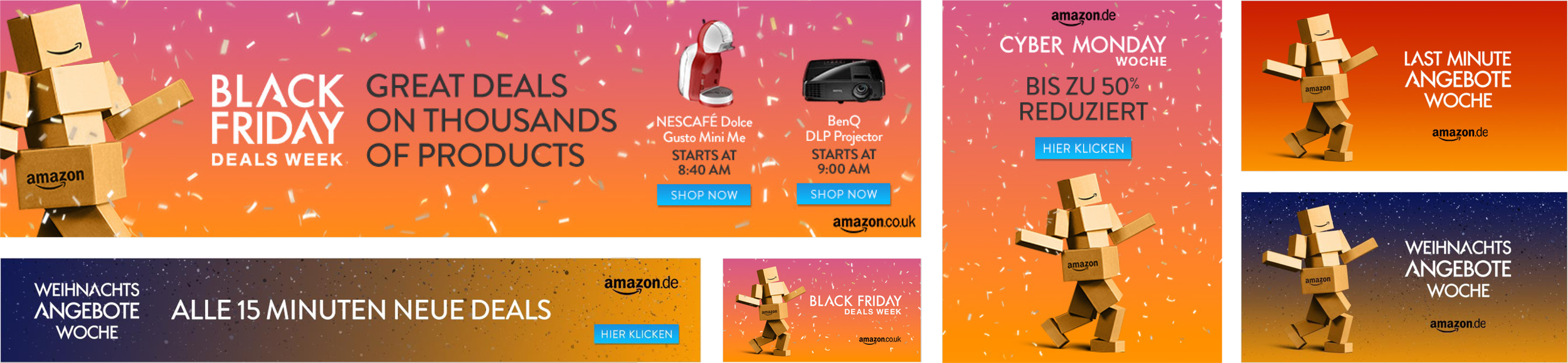 A collection of work for Amazon’s Black Friday campaigns for the EU from 2015-2019. Over the years, my responsibilities increased from owning the design rollout of digital display ads in 2015 and 2016, to conceptual art direction in 2017 and leading the design rollout from 2017 onwards. During these years, we would run the production entirely in-house, so this would involve overseeing a team of designers, managing workload, and QCing, then approving work for delivery.